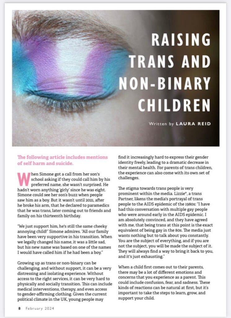 In one section of the magazine, parents are warned that their support on such matters “can determine their child’s mental wellbeing,” quoting statistics from Stonewall claiming that the number of trans children attempting suicide is “double the national average”.