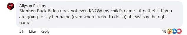 Allyson Phillips, posted on social media: “Biden does not even KNOW my child’s name – it’s pathetic! If you are going to say her name (even when forced to do so) at least say the right name!”