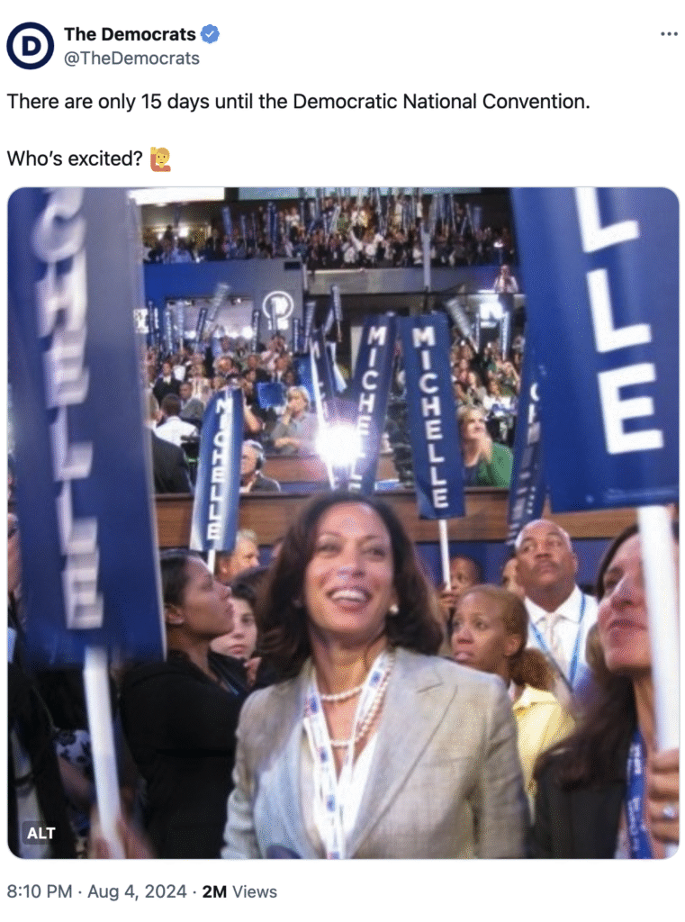 In a strange move, the official X account of the Democratic Party chose to upload an image of Kamala Harris that is 16 years old, surrounded by signs that say ‘Michelle’ as a way of promoting the upcoming Democratic National Convention.
