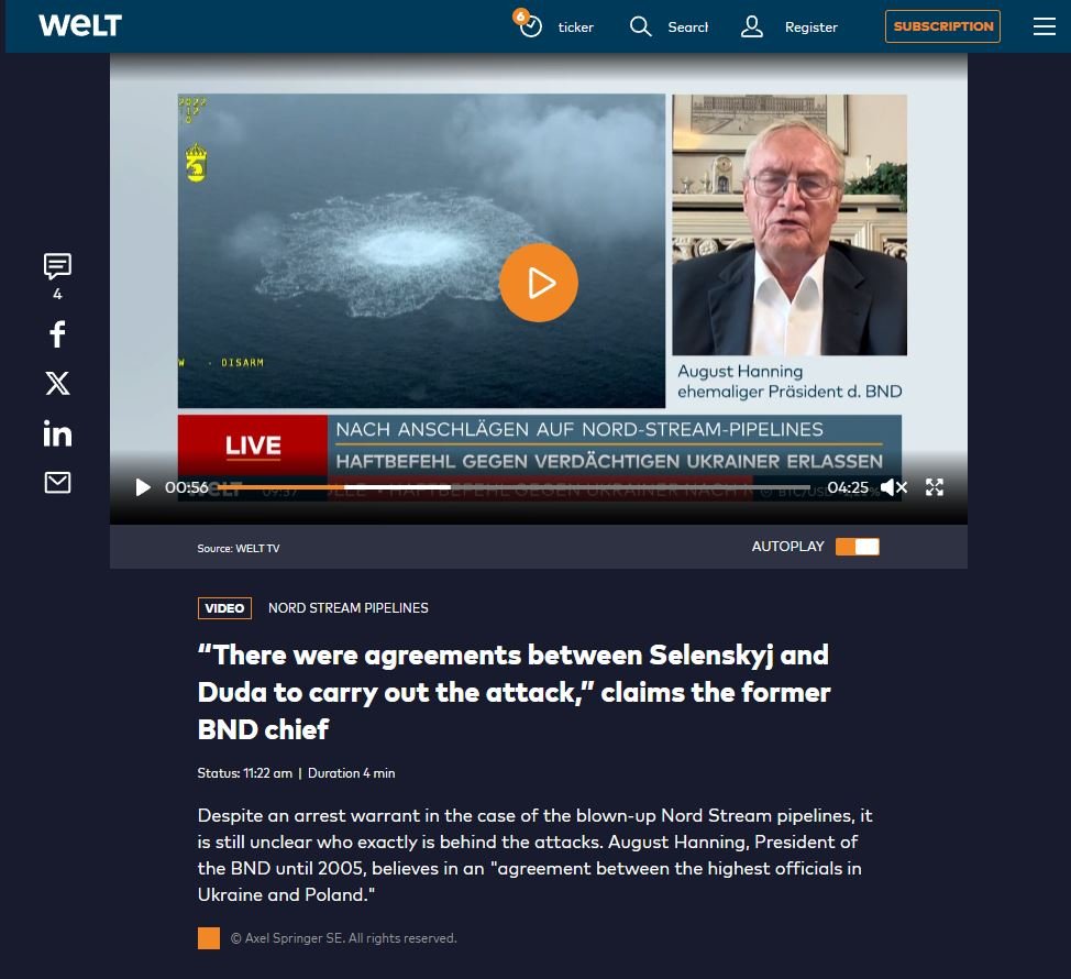 However, during an appearance on German broadcaster WELT-TV, August Hanning, who served as the head of Germany’s Federal Intelligence Service (BND) from 1998 to 2005, the attack was carried out at the behest of Zelensky and Andrzej Duda.
