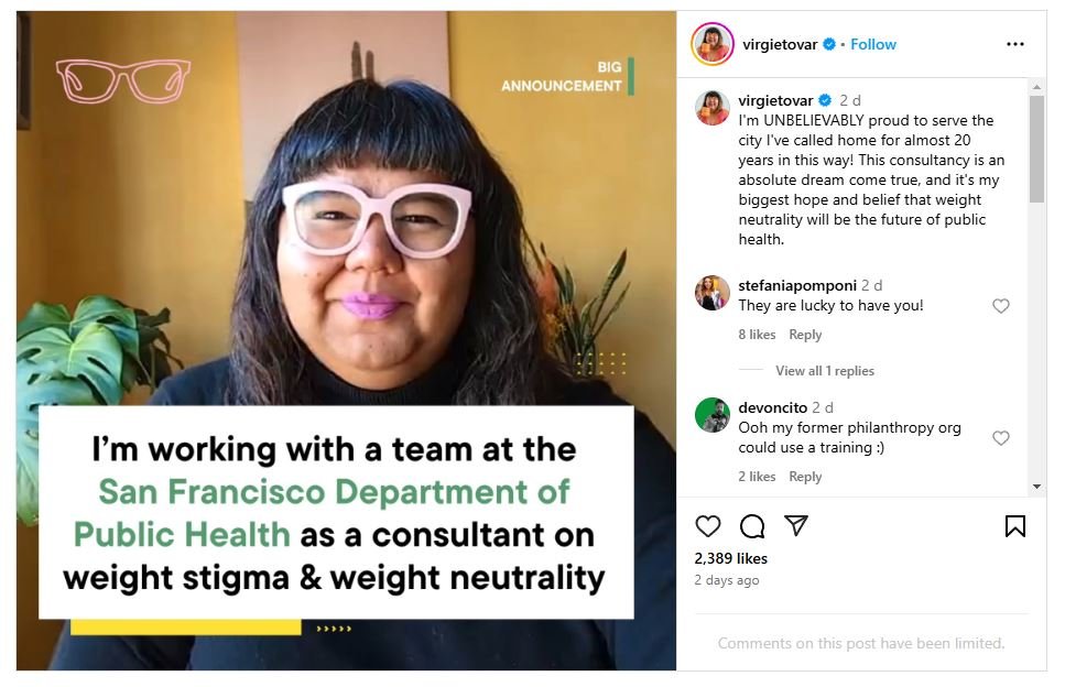 The San Francisco Department of Public Health has hired a self-described “unapologetically fat” body positivity activist to consult on “weight stigma and weight neutrality.”