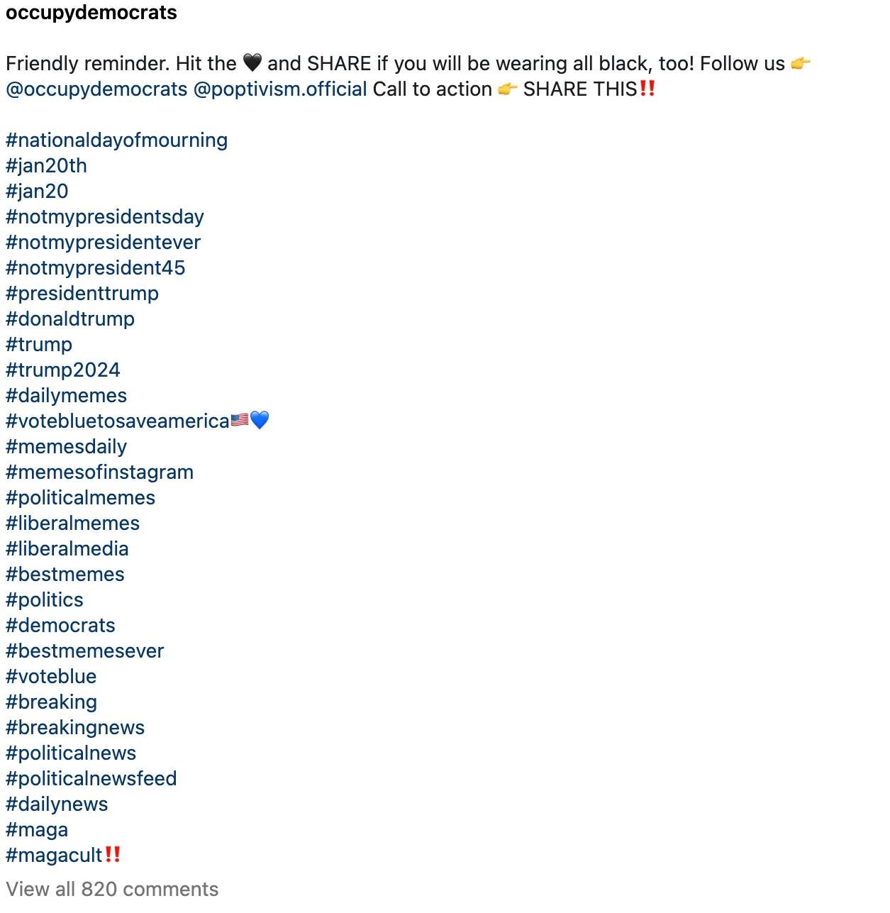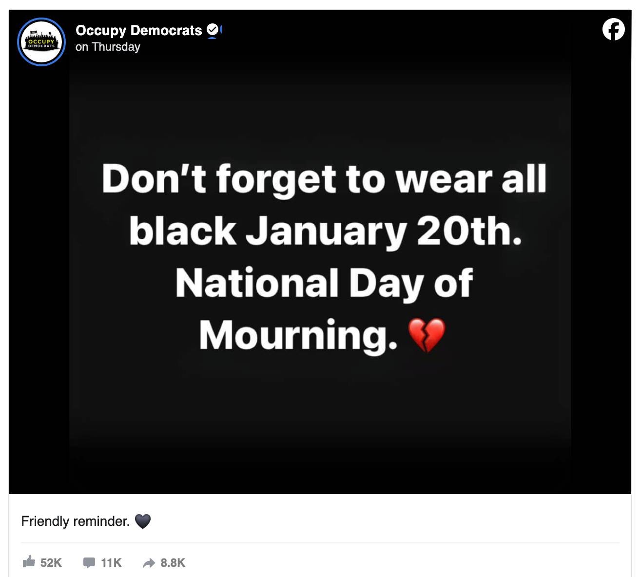The ‘Occupy Democrats’ Facebook group, which has over 10 million followers decreed “Don’t forget to wear all black on January 20th,” with an emoji of a broken heart.