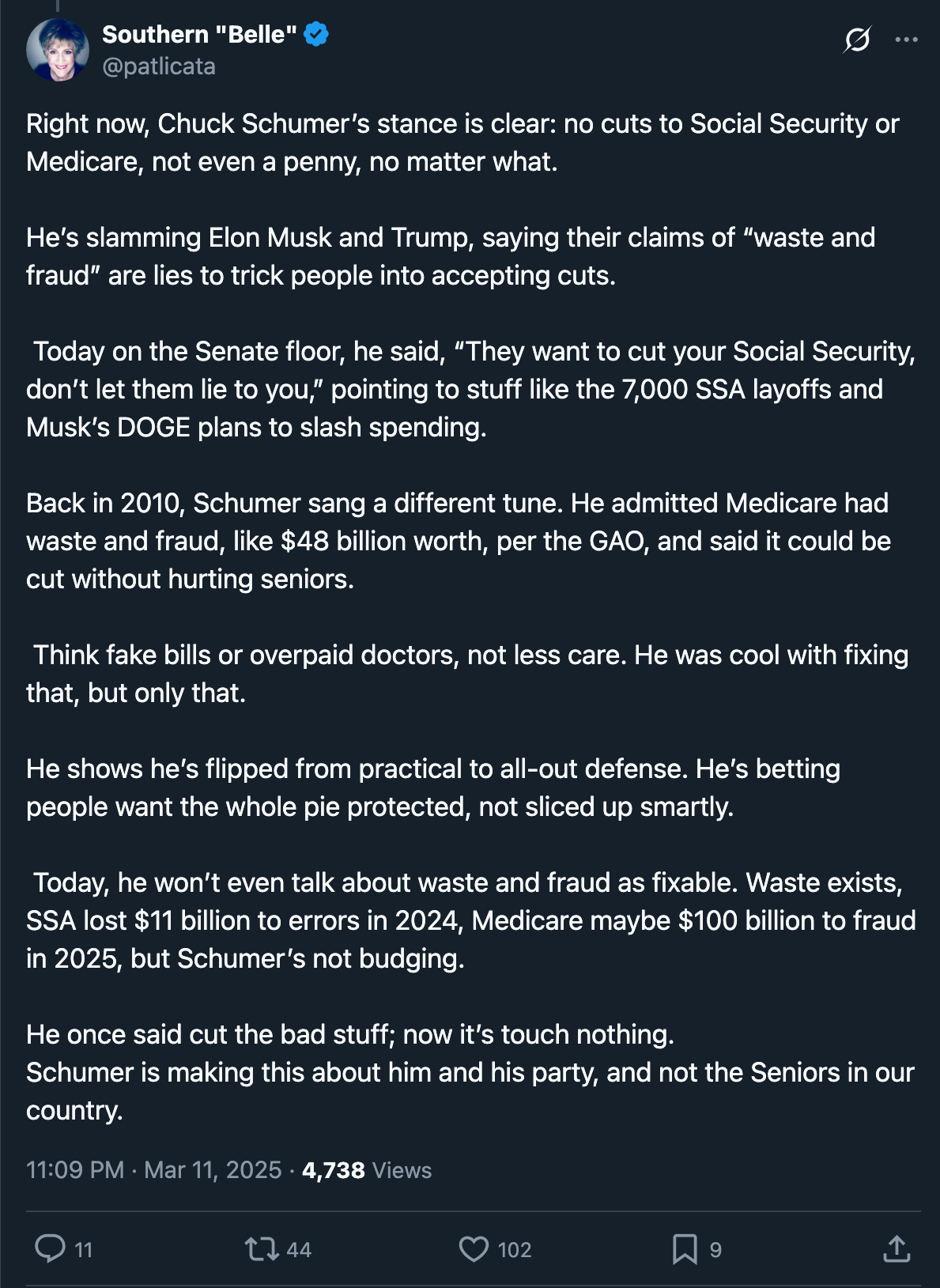 Chuck Schumer just posted that Elon is a liar for claiming that Social Security and Medicare have lots of waste, fraud, and abuse.
