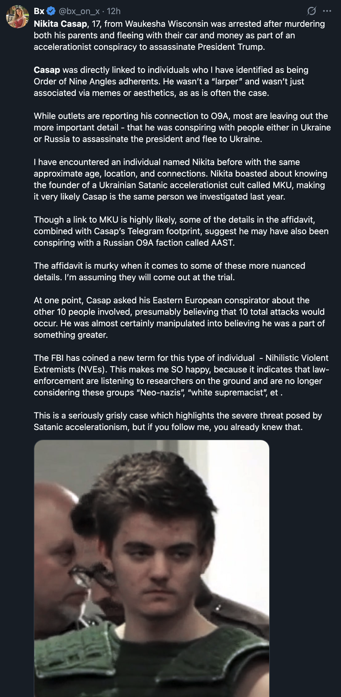 As this post further explains, Casap was also seemingly obsessed with the Satanic Order of Nine Angles: