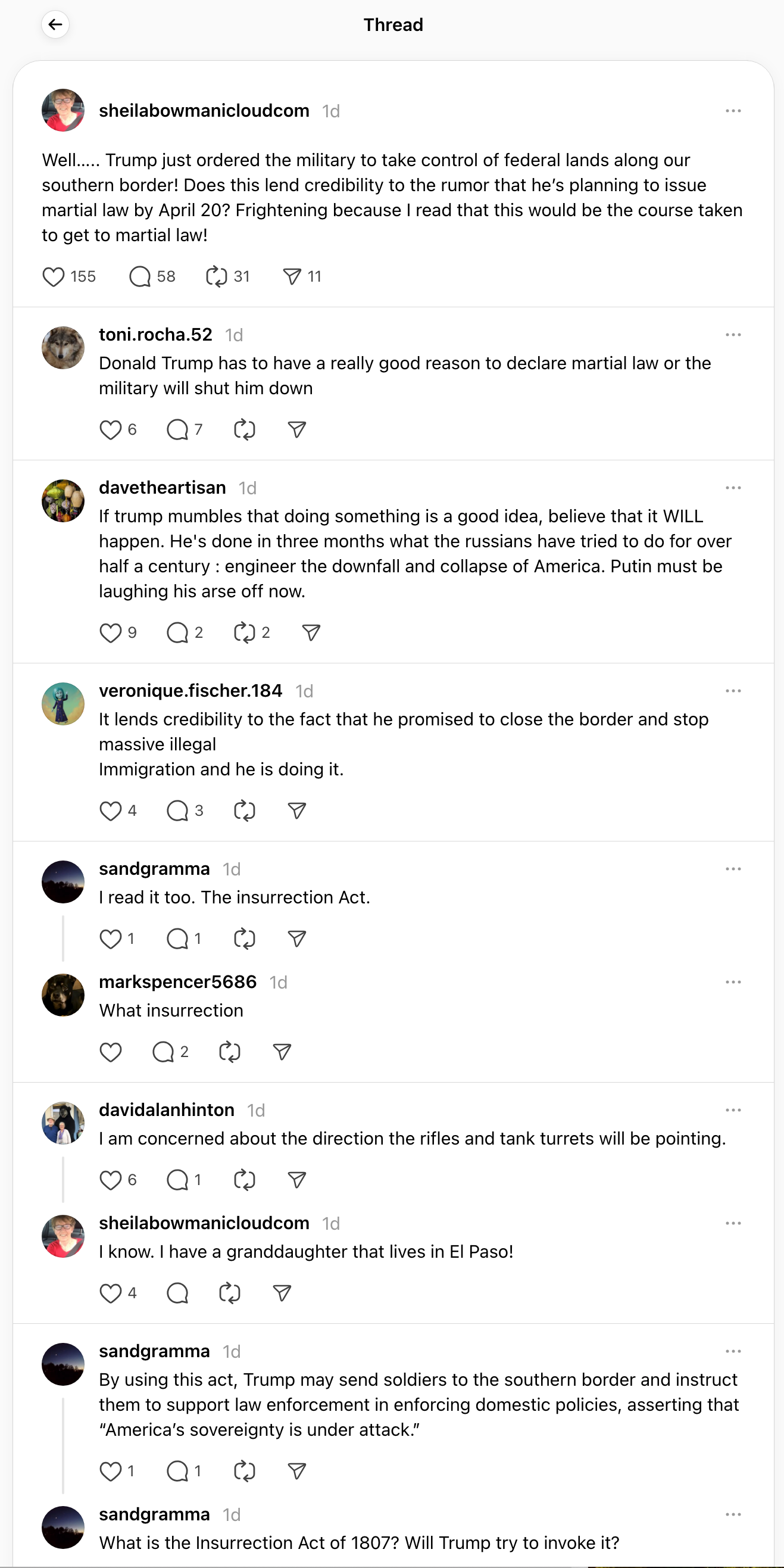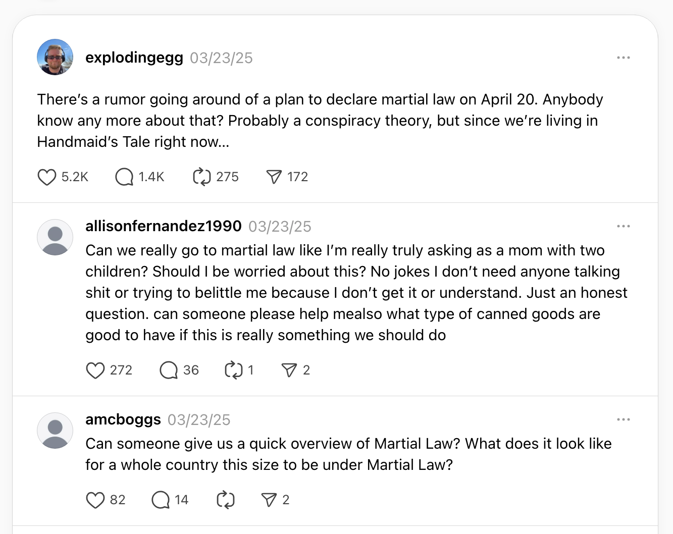 Deranged leftists on BlueSky and Threads (the left’s knock off versions of X) are adamant that President Trump is going to declare martial law on April 20th in order to arrest ‘minorities’ and start using the military to put down protests.