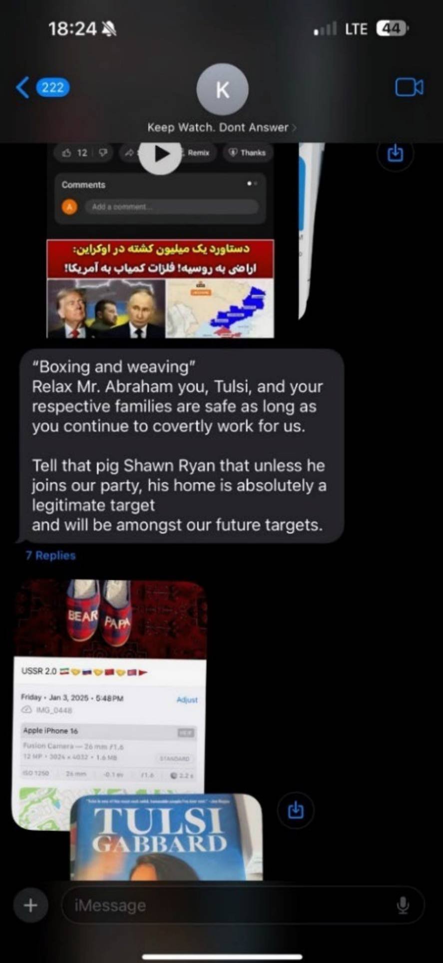 Other messages show a gun pointed at pictures Gabbard and her family.