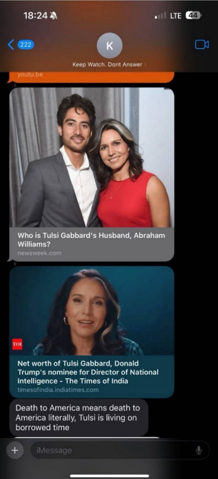 One states “You and your family are going to die soon … I will personally do the job if necessary,” while another states “Death to America means death to America literally, Tulsi is living on borrowed time.”