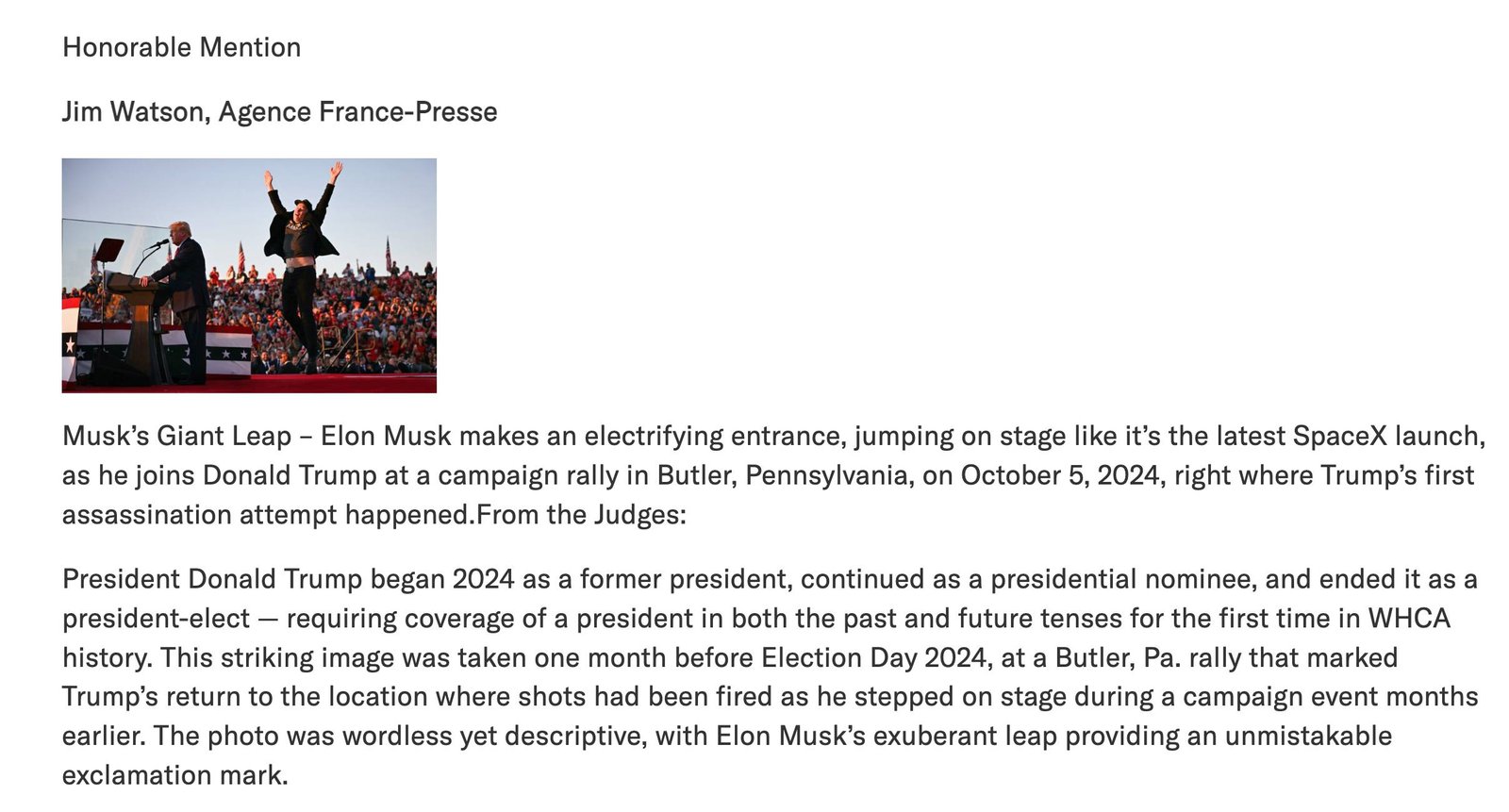 The Trump photo wasn’t even given an honorable mention. That went to a photo of Elon Musk jumping in the air with a grin on his face at the second Butler Trump rally.