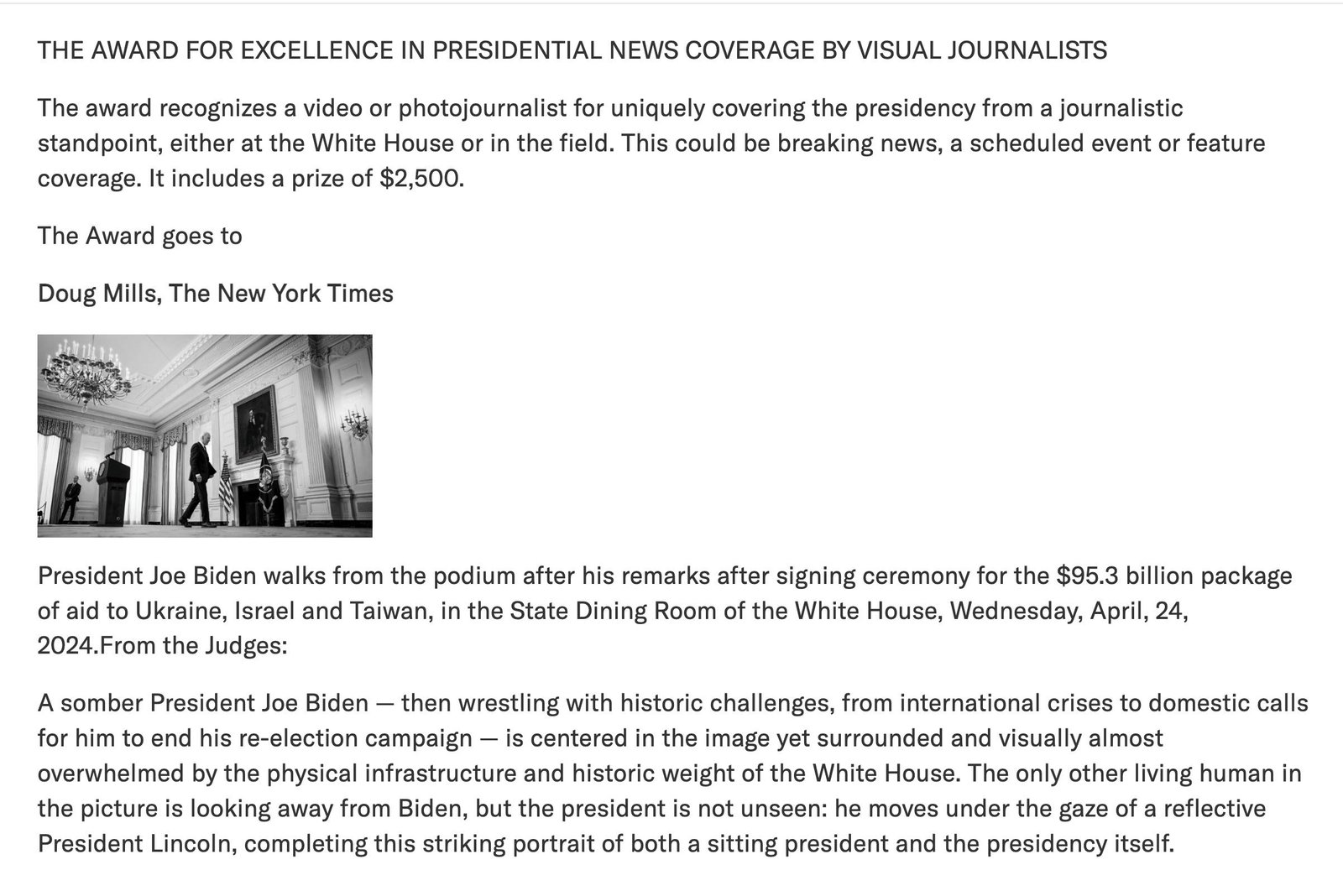 The WHCA award for presidential news coverage by visual journalists, which recognizes a video or photo journalist for uniquely covering the presidency at the White House or in the field went to Doug Mills of The New York Times for an image taken of former President Joe Biden as he wrestled with historic challenges, including international crises, amid calls for him to end his reelection campaign.