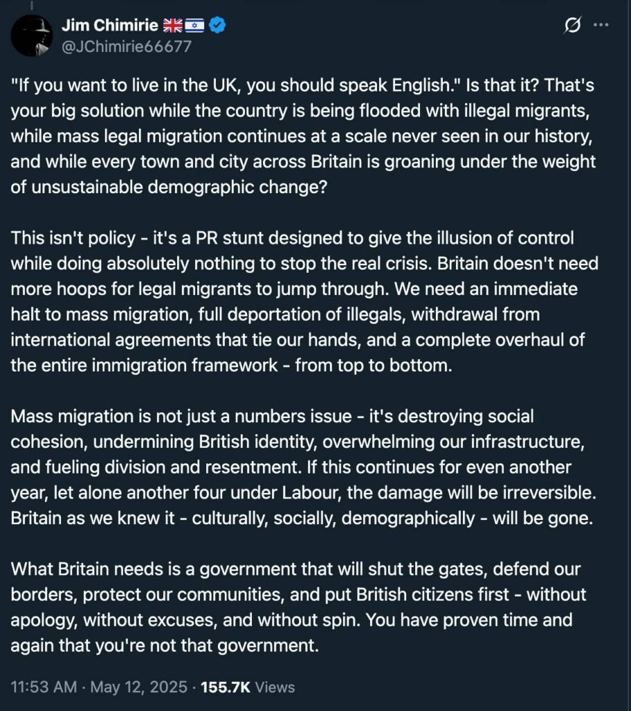Posts on X suggest the attack may be linked to pro-immigration activists or groups like Palestine Solidarity, angered by Starmer’s “island of strangers” rhetoric and English language mandate.