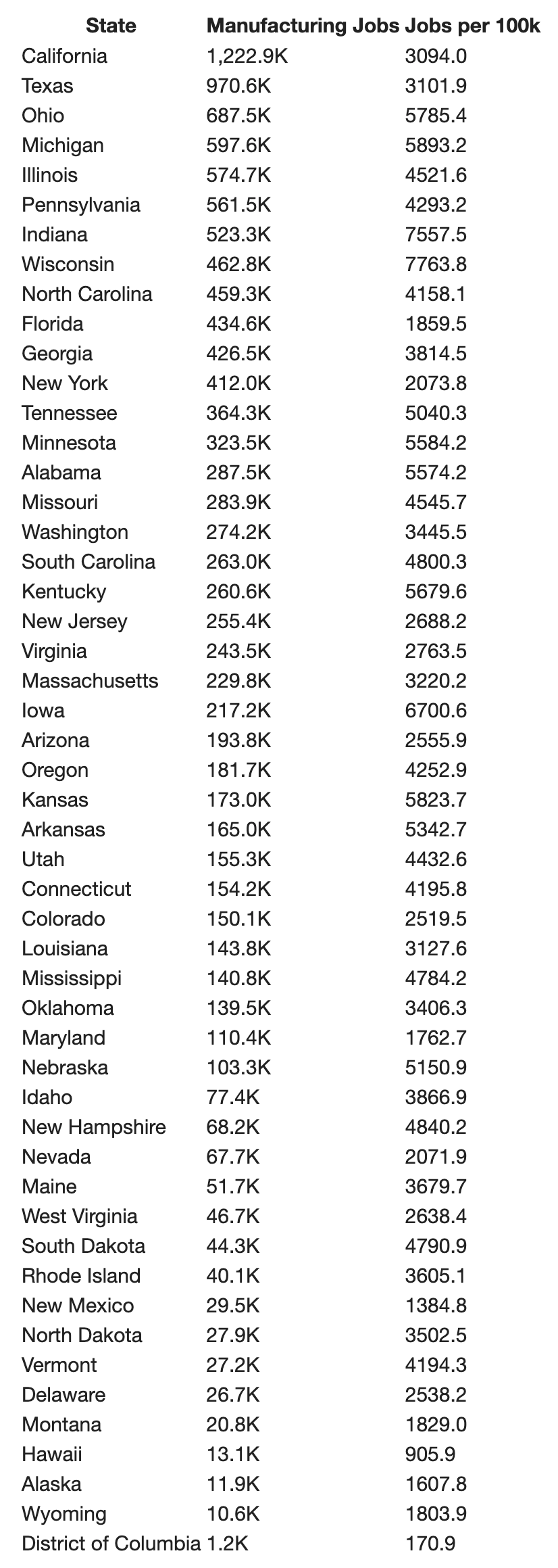 Wisconsin, ranked in the top 10 for total manufacturing employment, stands out for outperforming its size. Although it’s only the 20th most populous state, its manufacturing base remains strong, thanks in part to food and dairy processing. In per capita terms, it’s number one in the nation with 7,763.8 manufacturing jobs for every 100,000 people.