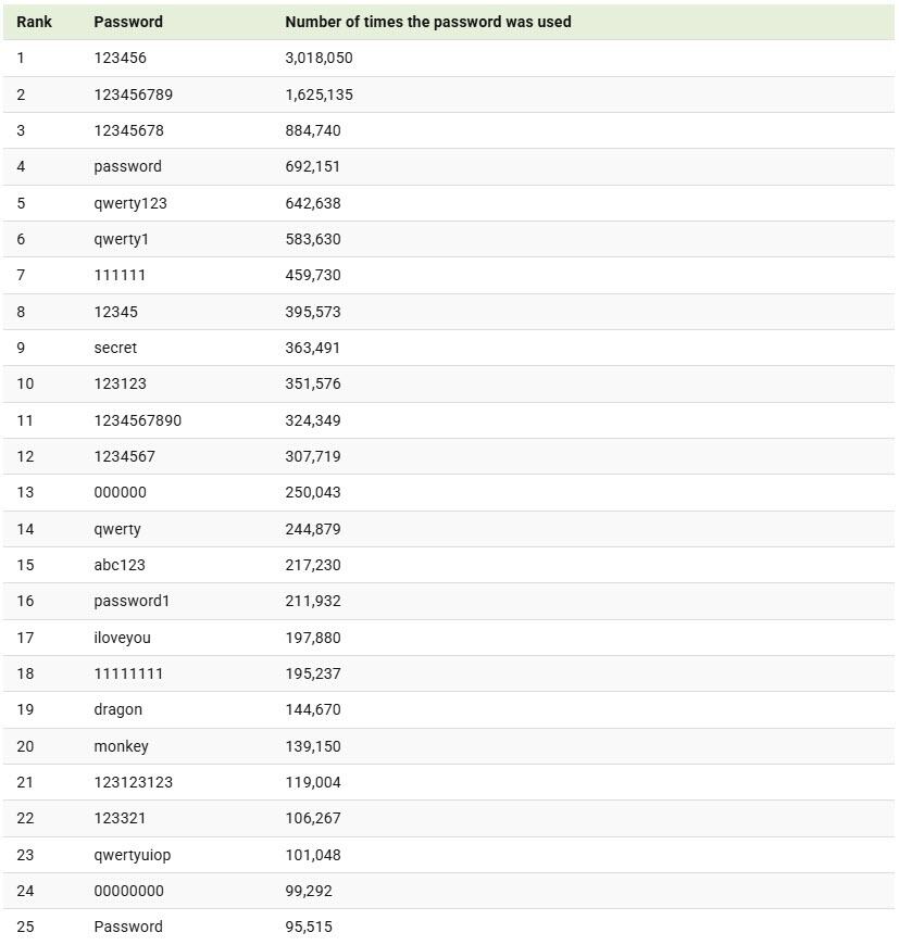 The top password—“123456”—was used over 3 million times in the dataset analyzed by NordPass. In fact, six of the top 10 passwords are purely numeric, highlighting how common predictable number patterns remain.