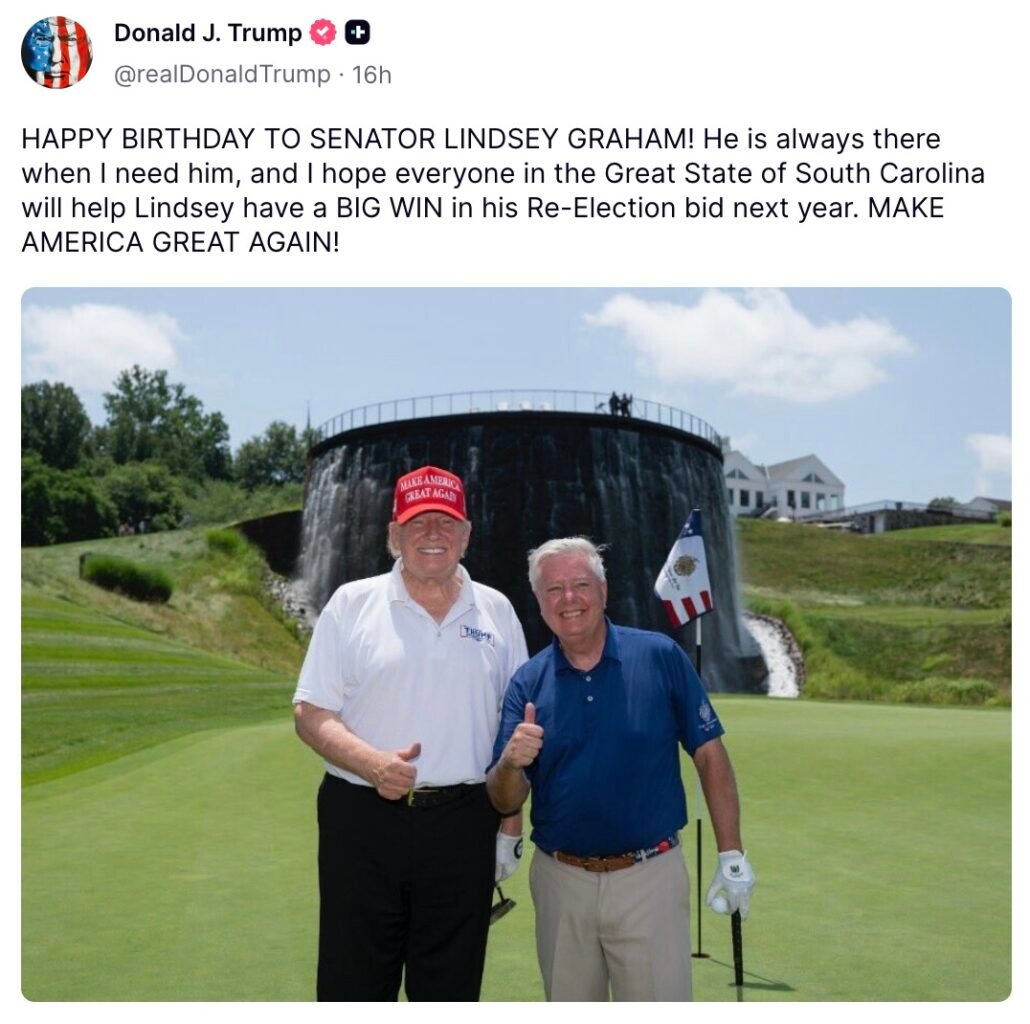 In a Truth Social post, Trump wrote “Happy Birthday to Senator Lindsey Graham!” alongside the pair smiling for a picture while golfing.