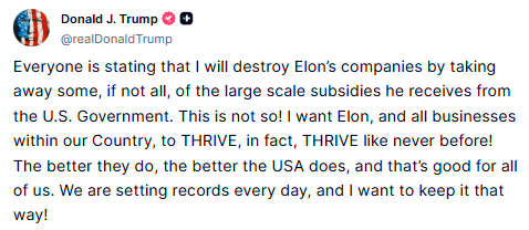 Responding to recent speculation, Trump posted on Truth Social: “Everyone is stating that I will destroy Elon’s companies by taking away some, if not all, of the large scale subsidies he receives from the U.S. Government. This is not so!”