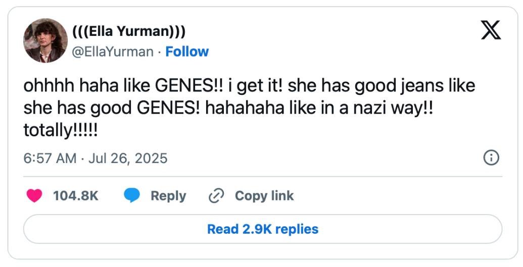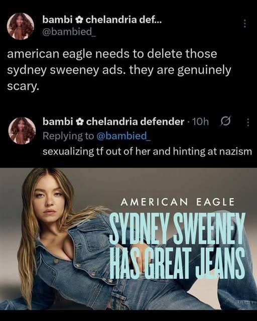 It’s got an Eagle logo, says the word jeans and Sweeney is white, so it’s literally Hitler.