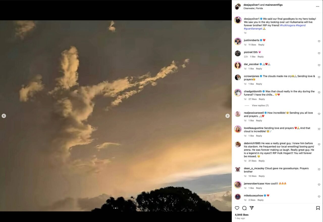 Musician Dee Jay Silver, posted the image to Instagram showing a cloud that formed in the shape of one of Hogan’s signature poses near Indian Rocks Baptist Church in Largo, Fla. where Hogan’s memorial service was held.