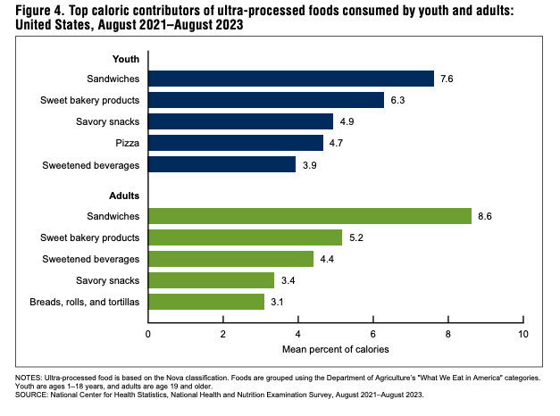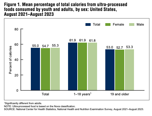 Here are the highlights from the CDC’s new report titled “Ultra-processed Food Consumption in Youth and Adults: United States, August 2021–August 2023”: