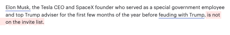 Noticeably absent, according to The Hill, was Elon Musk, whose strained relationship with President Trump earlier this year likely kept him off the guest list.