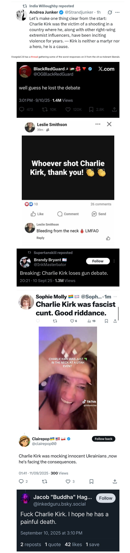 Democrats all over social media are now celebrating the assassination of Charlie Kirk. pic.twitter.com/eKxk94Dirh