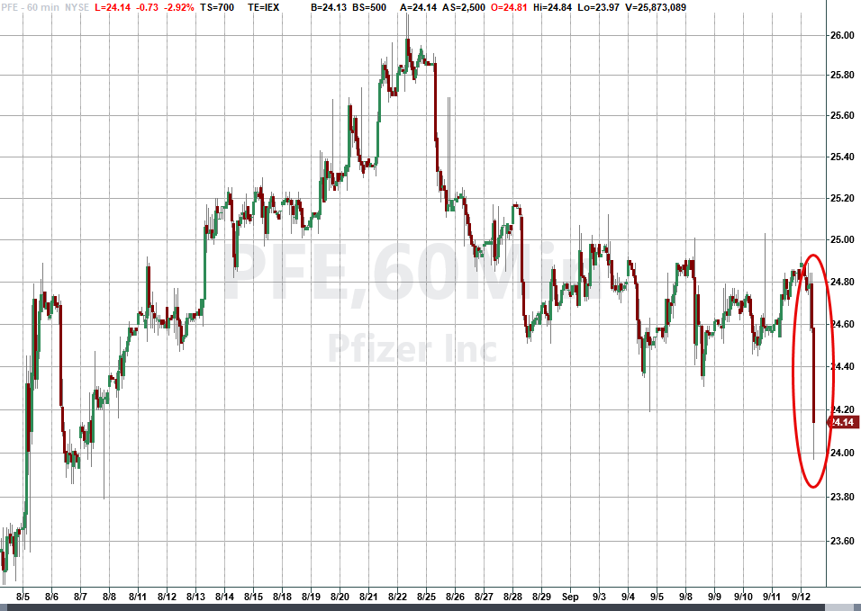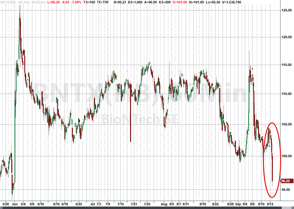 As a result shares in Pfizer, BionNTech, and Moderna spiked sharply lower in Friday trade: