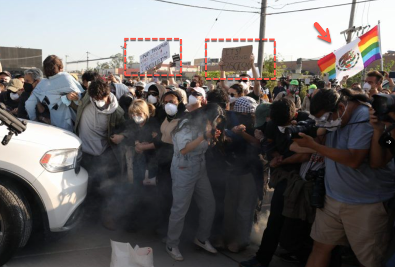 Protesters, some possibly skipping work and others suspected of being professional agitators funded by shadowy NGOs, carried the usual signs – “Fascists,” “Resist Trump” – and waved a LGBTQ Mexican flag.