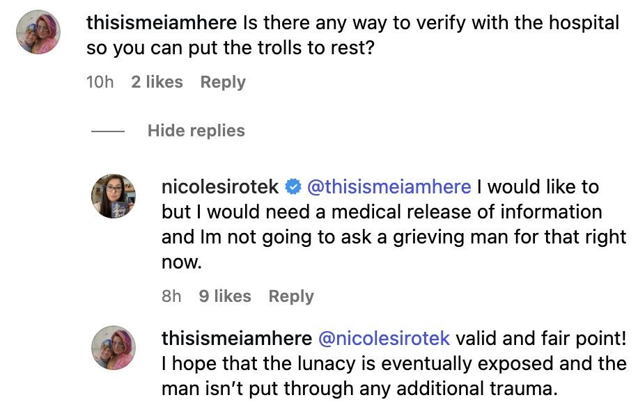 The story has not been verified and Sirotek has further noted that medical privacy laws prevent her from releasing identifying details of those involved.