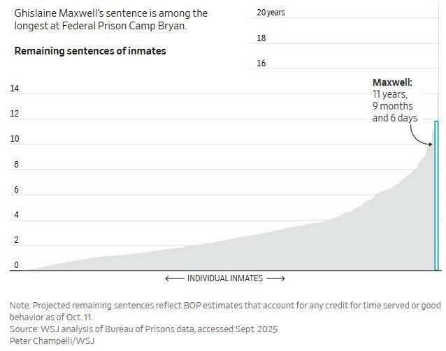 Bryan isn’t exactly Club Fed – but it’s no fortress. Six guards can watch 600-plus inmates on early shifts, and most residents are white-collar, low-risk, or nearing release. Maxwell is the rare exception: records show she has one of the longest remaining sentences at the camp and sits alongside high-profile inmates like Elizabeth Holmes and reality-TV figure Jennifer Shah. She’s projected to be freed in 2037 with credit and good time.