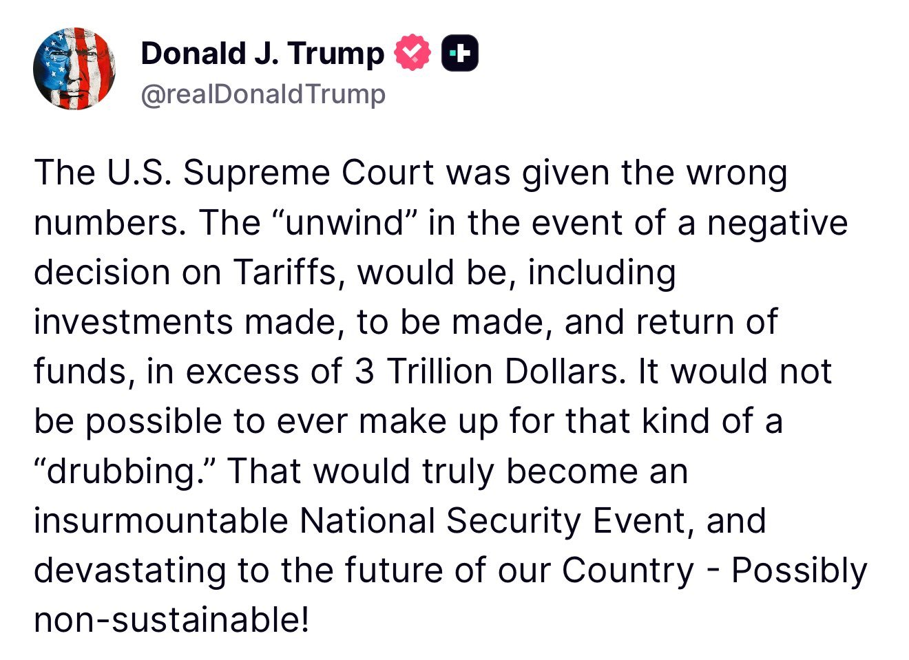 Trump states: “The U.S. Supreme Court was given the wrong numbers. The ‘unwind’ in the event of a negative decision on Tariffs, would be, including investments made, to be made, and return of funds, in excess of 3 Trillion Dollars.”