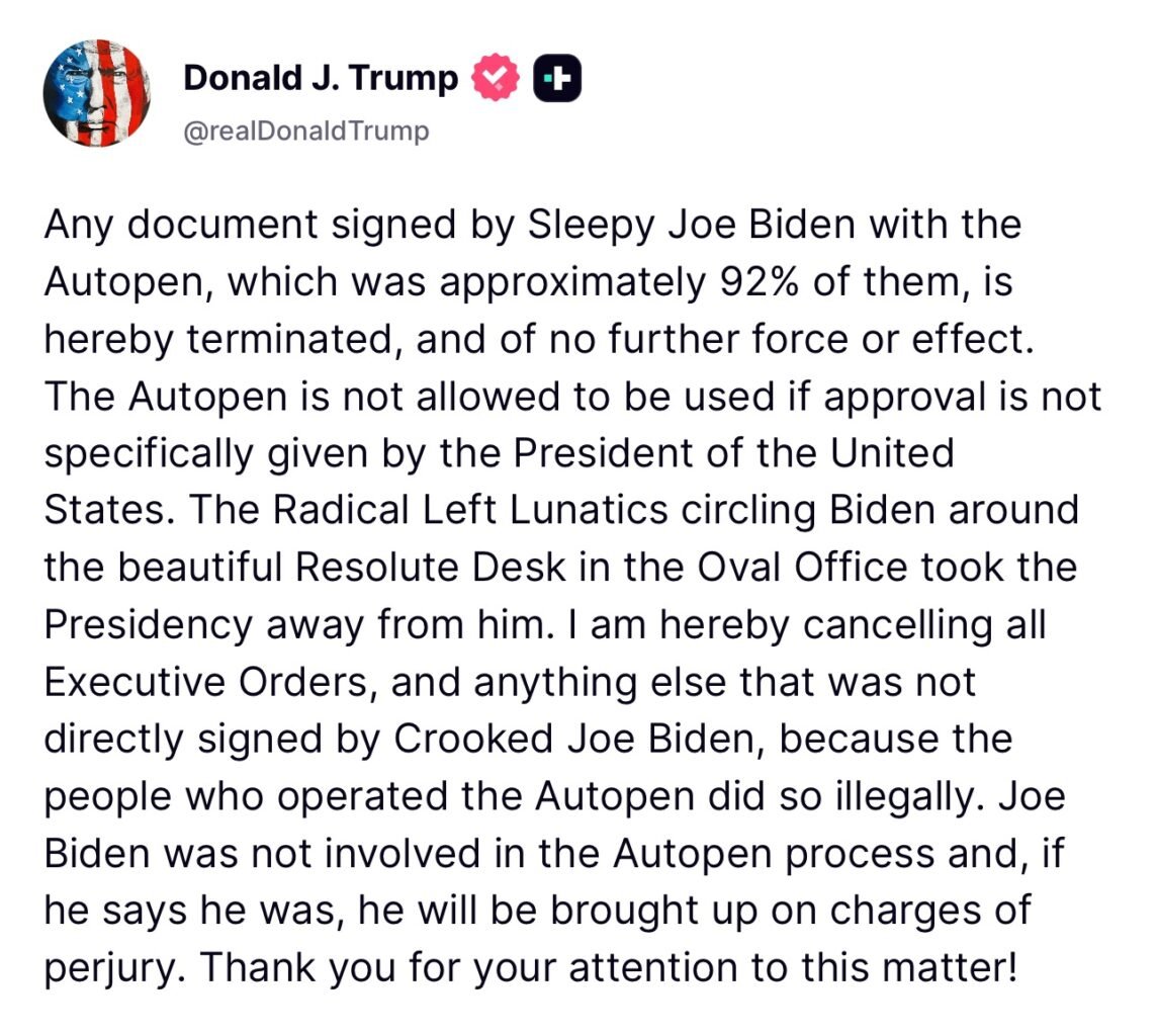 Trump’s Truth Social edict, reads, “Any document signed by Sleepy Joe Biden with the Autopen, which was approximately 92% of them, is hereby terminated, and of no further force or effect.”