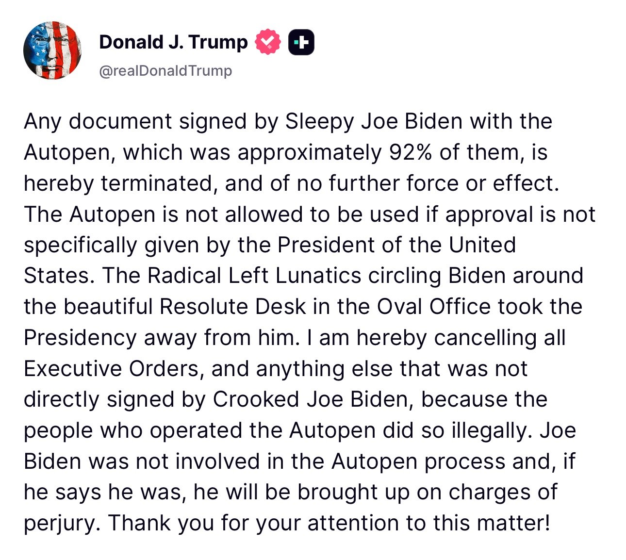 In a final kicker, Trump noted that “Joe Biden was not involved in the Autopen process and, if he says he was, he will be brought up on charges of perjury. Thank you for your attention to this matter!”