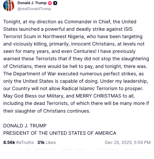 .@POTUS “Tonight, at my direction as Commander in Chief, the United States launched a powerful and deadly strike against ISIS Terrorist Scum in Northwest Nigeria, who have been targeting and viciously killing, primarily, innocent Christians, at levels not seen for many years, and… pic.twitter.com/ct7rUW128t