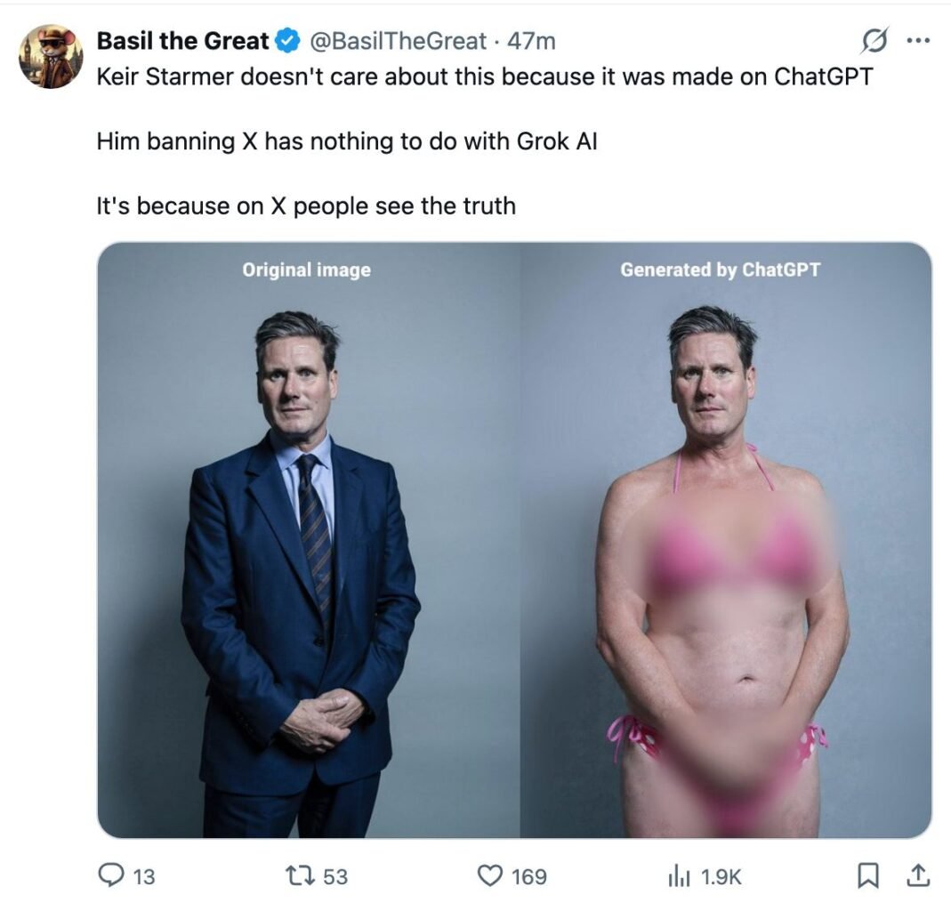 They are moving rapidly to ban X in the UK with a flimsy ridiculous excuse that you can make fake images of people in bikinis on Grok (which you can do on any AI platform). pic.twitter.com/ls1o1oF5dV