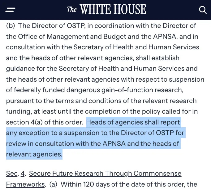 But Executive Order 14292, cited by the agency leaders in their Nature publication, confirms the administration is allowing GOF “exemption[s].”