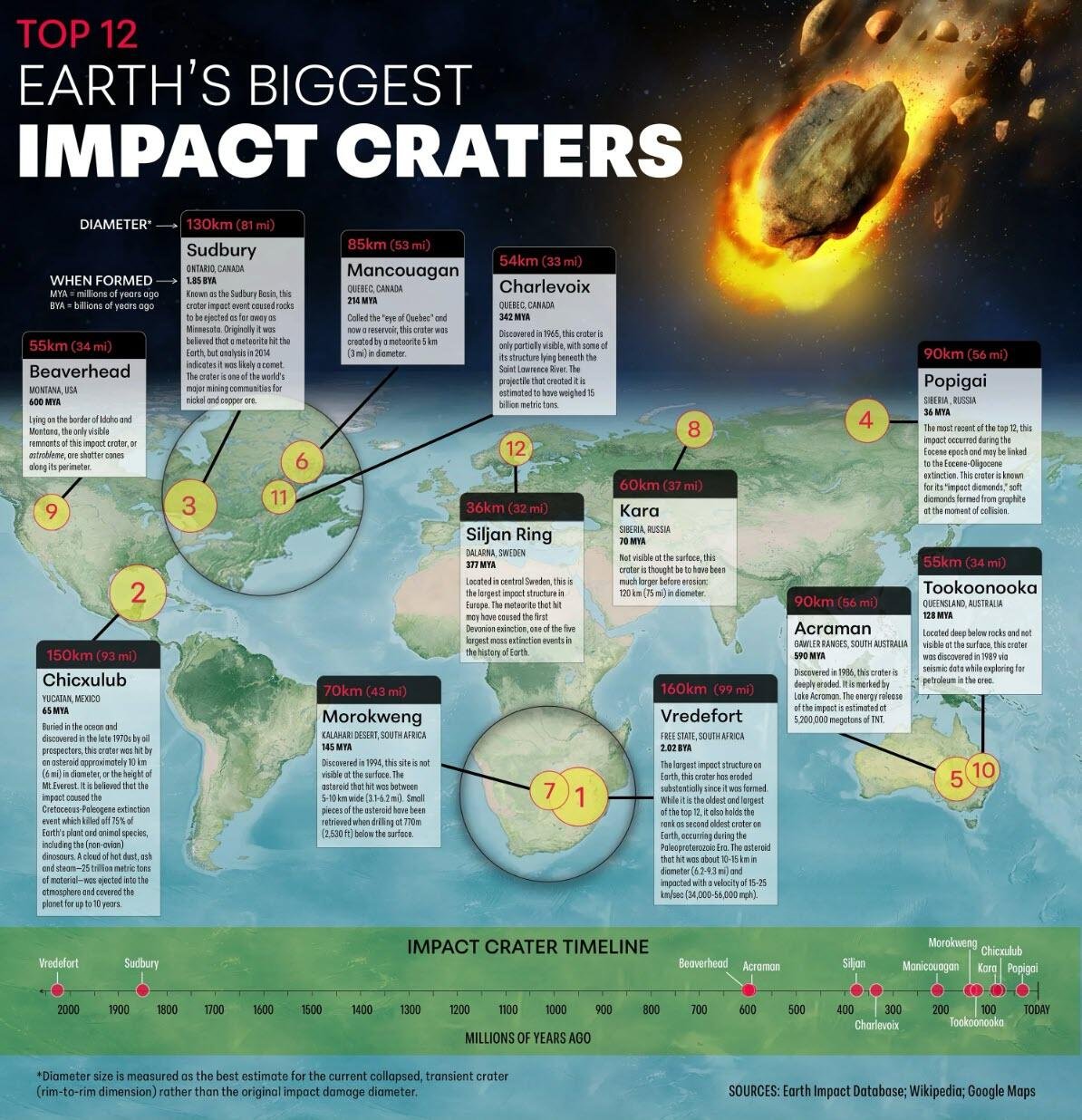 This map by Julie Peasley for Visual Capitalist uses data from the Earth Impact Database to showcase the 12 largest confirmed impact craters on Earth, ranging from massive basin-forming events to relatively recent collisions.