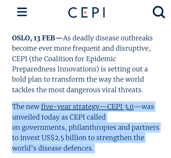 The Coalition for Epidemic Preparedness Innovations (CEPI)—founded in 2017 by the Bill & Melinda Gates Foundation, the World Economic Forum, and national governments—announced last week that it is now seeking an additional $2.5 billion to expand its pandemic vaccine financing programs.
