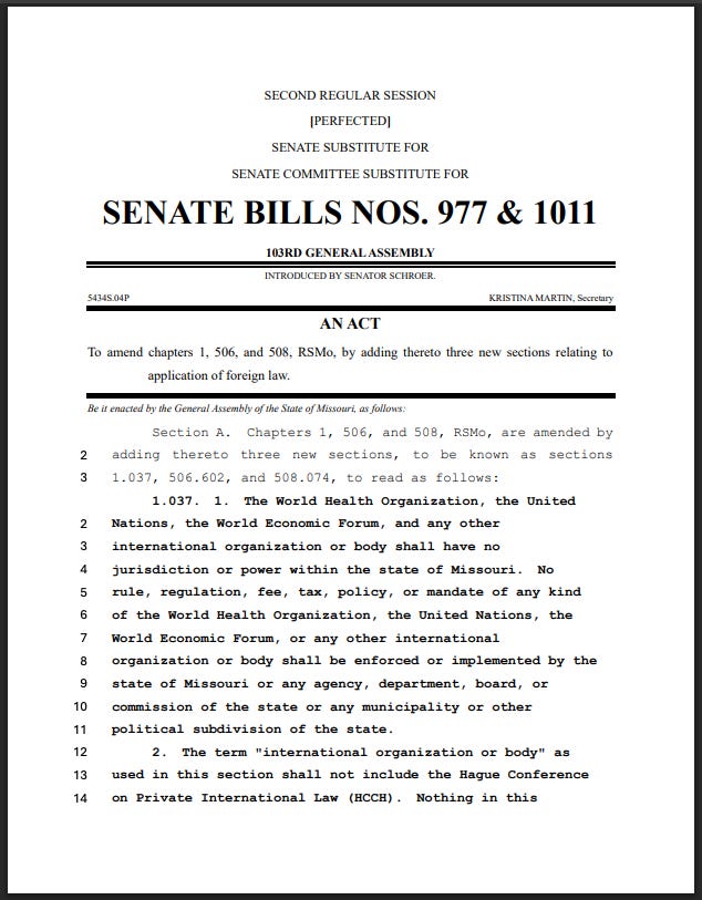 The bill’s language is explicit: “The World Health Organization, the United Nations, the World Economic Forum, and any other international organization or body shall have no jurisdiction or power within the state of Missouri.”