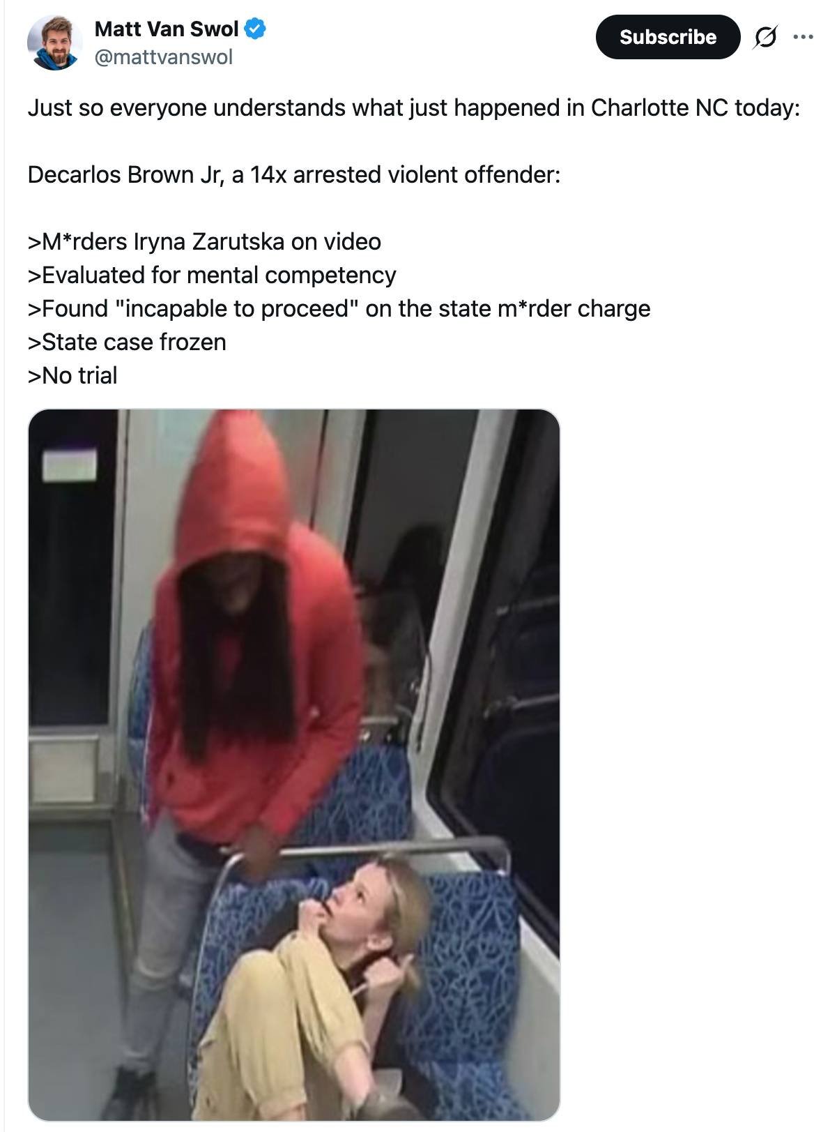 Brown, a 35-year-old homeless and mentally ill man with a lengthy rap sheet, was caught on video repeatedly stabbing 23-year-old Iryna Zarutska from behind on a Charlotte light rail train in August 2025.