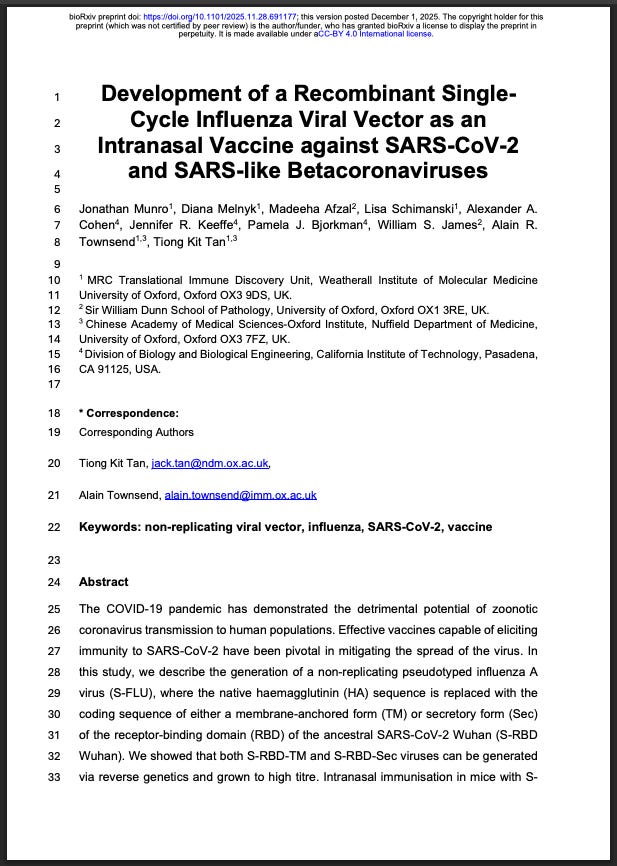 The study explicitly confirms that influenza’s native receptor-binding gene was removed and replaced: “the native haemagglutinin (HA) sequence is replaced with the coding sequence of… the receptor-binding domain (RBD) of the… SARS-CoV-2”