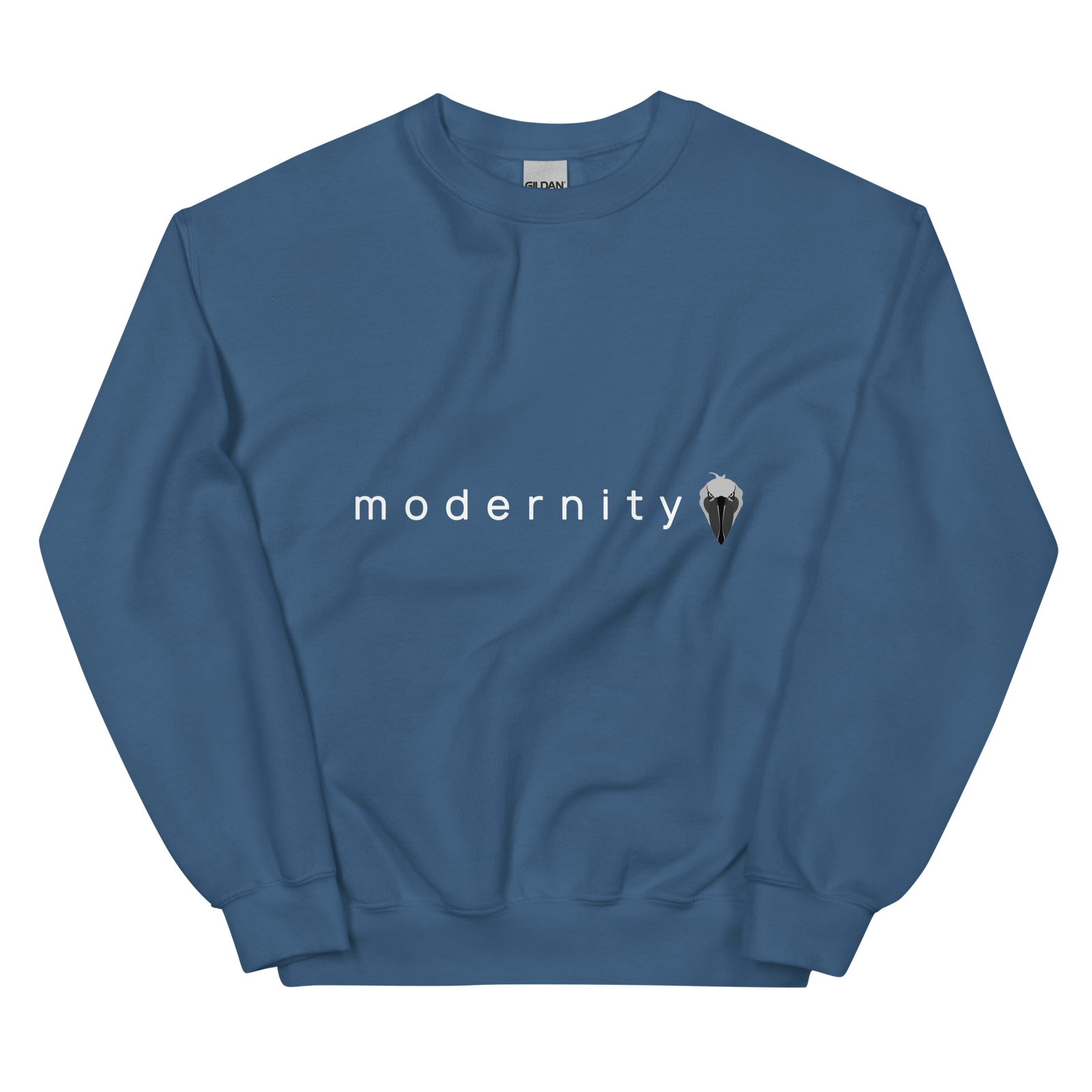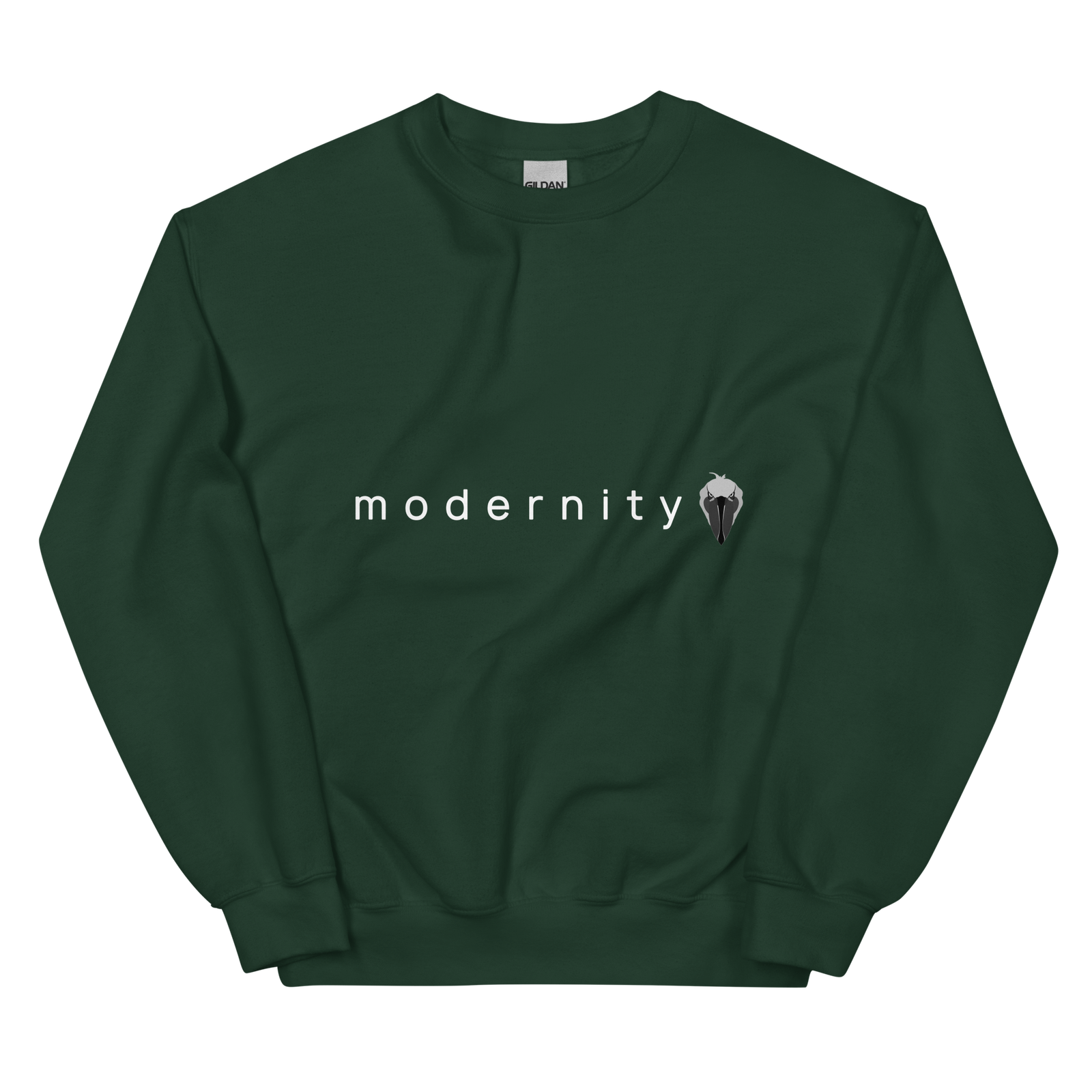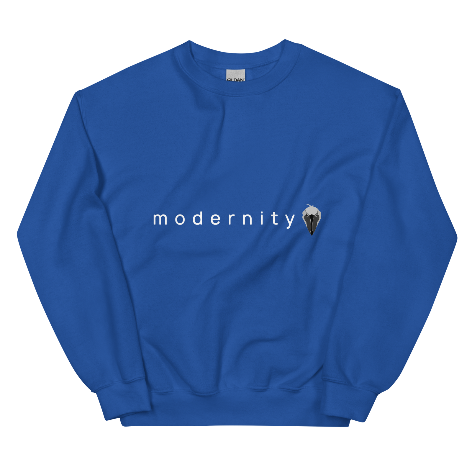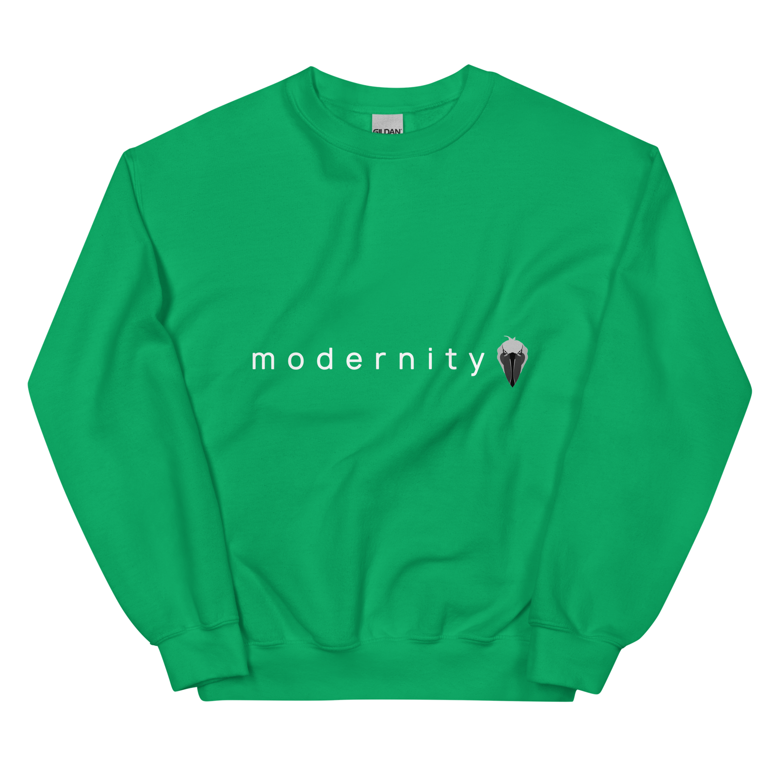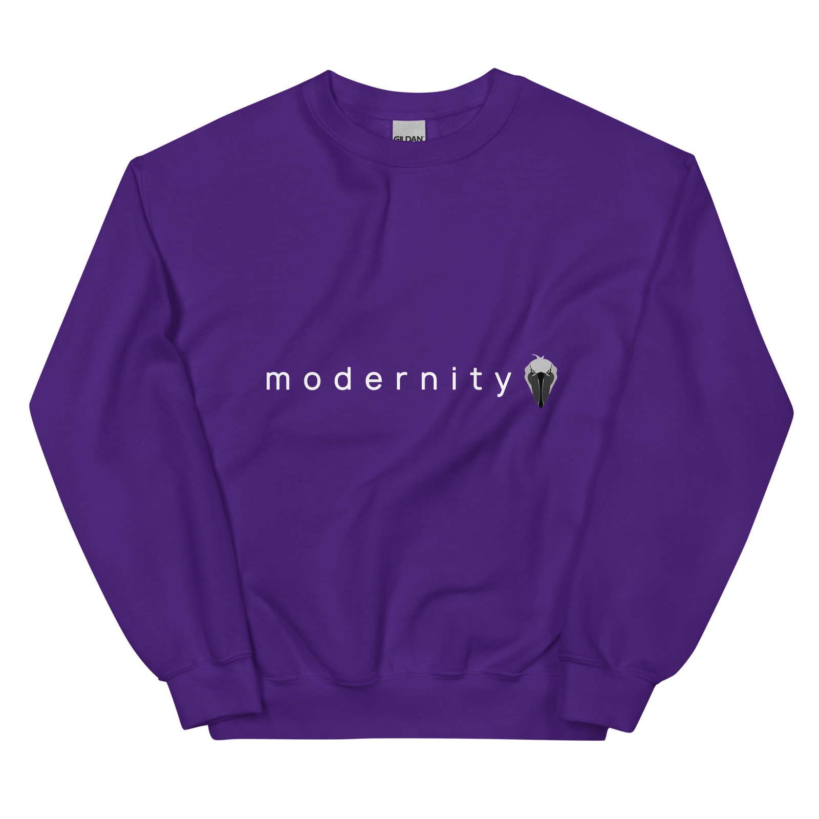 Catch the eye of passers by with this sweatshirt emblazoned with the m o d e r n i t y typeface and the classic shoebill! Available in a range of sizes and colours.